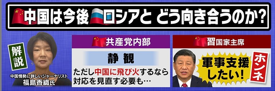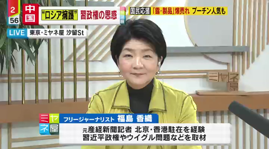国営メディアも含めて、これまで“ロシア擁護”の姿勢を貫いている中国ですが、侵攻後、国民の間でもロシアを応援しようという気運が高まり、ロシア製品が爆発的に売れているようです。ウクライナ侵攻の行方のカギ握るとも言われている中国は、なぜロシア擁護を続けるのか?そして、今後どう動いていくのか?中国が使い分ける「ホンネ」と「建前」を、中国事情に詳しいジャーナリストの福島香織さんが徹底分析します。