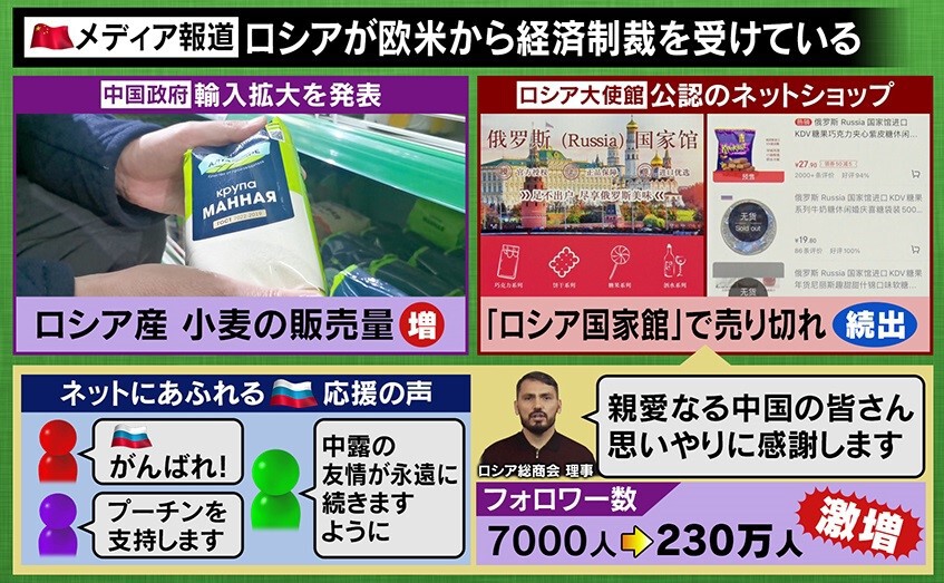 中国政府は、ロシア産の小麦の輸入拡大を発表しています。さらにロシア大使館公認のネットショップ「ロシア国家館」では、ロシア寄りの報道もあってか、ロシア産のお酒やお菓子が飛ぶように売れ、売り切れ状態になっています。経済制裁を受けているロシアを応援しようと、ロシア製品の購入を呼びかる動きもあったといいます。また、このネットショップのSNSに「ロシア頑張れ」や「プーチンを支持する」「中露の友情が永遠に続きますように」などと言った書き込みが見られ、フォロワーが7千人から230万人に激増したということです。