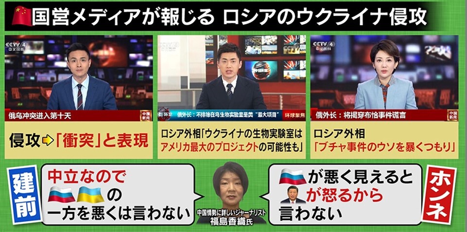 今回のロシアによるウクライナ侵攻を、中国の国営メディアはどのように報じているのでしょうか。まず、「軍事侵攻や侵略」という言葉を使わずに「衝突」と表現しています。また「ブチャ事件のウソを暴く、虐殺報道はフェイクニュースだ」「マリウポリの小児病院への攻撃もロシアは関与を否定している」というロシア側の主張をそのまま報じています。そして「ウクライナの生物実験の研究にアメリカが関与している」というロシア側の主張も連日報道して、まるで「新型コロナの起源は中国の武漢だ」と言ったアメリカに、仕返ししているようにも見えます。建前としては一応“中立”ですが、メディアの本音は、「ロシアが悪く見えると習近平国家主席が怒るので言えない」ということのようです。