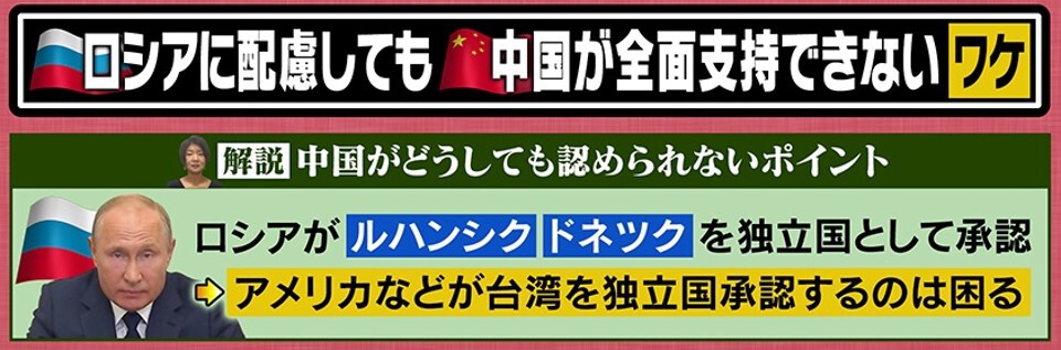 「ウクライナ東部の独立をロシアが承認したことで、同じようにアメリカが台湾を独立として承認してしまうと困る、ということがあるんです。これは中国は絶対に受け入れられません。中国はウクライナを主権国家としていち早く認めた国の一つです。『主権国家の領土は不可分だ』というのが中国の一貫した原則です。台湾についてはずっと『中国の領土だ、不可分なんだ』と言っていますが、現実的には台湾で住民投票をしたら、独立を選ぶ人が多いかもしれないので、今のロシアがウクライナ東部でしていることを認めるのは難しいと思います」