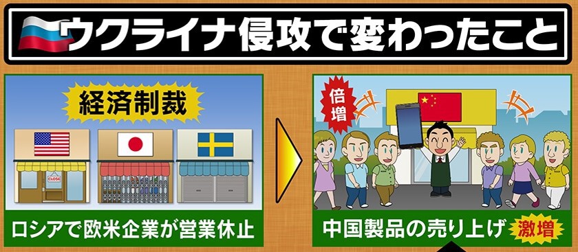 一方、欧米の企業がロシアのウクライナ侵攻に対する経済制裁の一環として、一斉にロシア国内での営業を休止した結果、中国製品の売り上げが激増したということです。