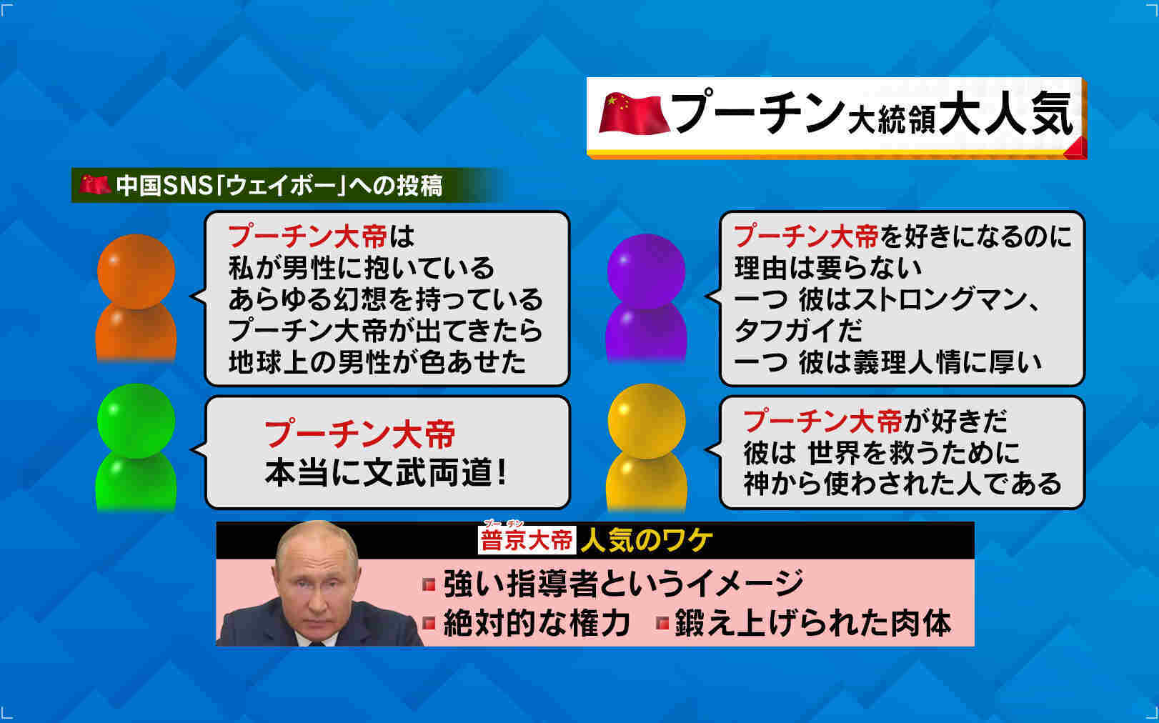 さらに、中国最大のSNS「ウェイボー」では「プーチン“大帝”を好きになるのに理由はいらない」「彼はストロングマン、タフガイ」「彼は義理人情に厚い!」「プーチン大帝が出てきたら地球上の男性が色あせたわ」などという書き込みが見られます。中国では以前からプーチン大統領の人気は高く、侵攻が続く今でも熱烈な“プーチンファン”は健在だといいます。