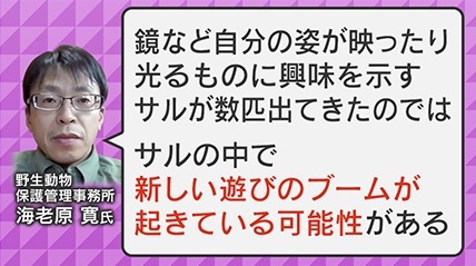 野生動物に詳しい海老原寛氏によると、「鏡など自分の姿が映ったり光ったりするものに興味を示すサルが数匹出てきたのでは。サルの中で、新しい遊びのブームが起きている可能性がある」ということです。
