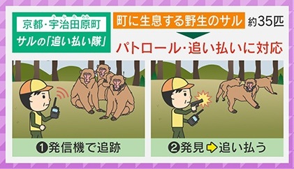 宇治田原町にはサルの『追い払い隊』がいて、町に生息する野生のサル約35匹に対し、パトロール・追い払いに対応しています。発信機を付けたサルを使って群れを追跡し、発見次第、音などを使って追い払っているということです。