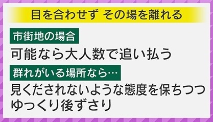 もしも野生のサルを見かけたら、目を合わせず、その場を離れてください。市街地の場合、可能なら大人数で追い払い、群れがいる場所なら、見下されないような態度を保ちつつ、ゆっくり後ずさりするといいということです。