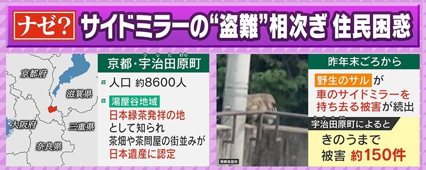 京都・宇治田原町の湯屋谷地域は日本緑茶発祥の地と知られ、茶畑や茶問屋の町並みが日本遺産に認定されています。そんな宇治田原町では、2024年末ごろから野生のサルが車のサイドミラーを持ち去る被害が続出していて、町によると2025年7月24日までで被害は約150件にのぼるということです。