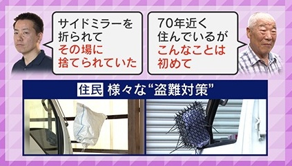 被害に遭った人は、「サイドミラーを折られて、鏡だけなくなってカバーはその場に捨てられていた」「70年近く住んでいるが、こんなことは初めて」と話しています。材木工場ではトラック5台が被害に遭い、修理代金は7万円だったということです。住民らはミラーに袋を被せるなど、様々な“盗難対策”を取っています。