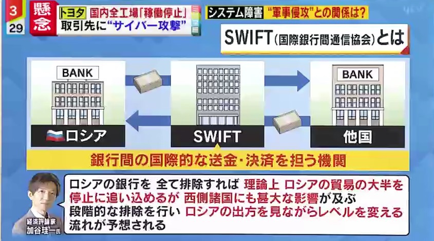 先行き不透明なウクライナ情勢。西側諸国はロシアの主要銀行の“SWIFT(国際銀行間通信協会)除外”を決定、ロシアは銀行間の国際的な送金や決済を止められようとしています。これらのことにより、私たちの生活にも大きな影響が懸念されています。これからいったい何が起こるのか、どう対策すればよいのか経済の専門家が徹底生解説します!