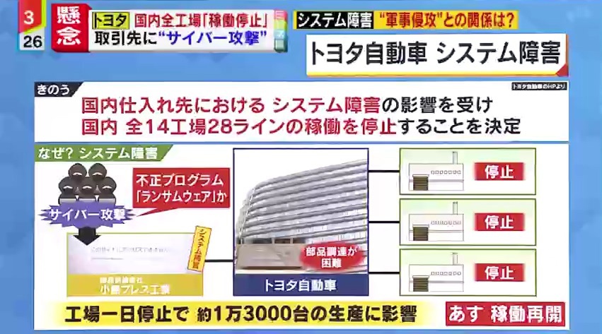 トヨタ自動車は、3月1日国内仕入れ先のシステム障害の影響で、国内全14工場28ラインの稼働を停止すると発表しました。1日停止するだけで、およそ1万3000台の生産に影響するといいます。その要因となったのが、小島プレス工業で、不正プログラム、ランサムウエアを使ったサイバー攻撃を受けたと言います。
