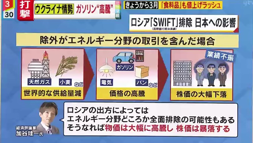 「エネルギー分野にSWIFT除外対象が及ぶと、世界的に天然ガスや小麦などの供給量が減ります。そうすると、電気やガソリン、パンなどの価格が上昇します。それによってそれらの製造会社やその取引先の業績不振が起こり、株価の下落を招くということが起こると考えられます」
