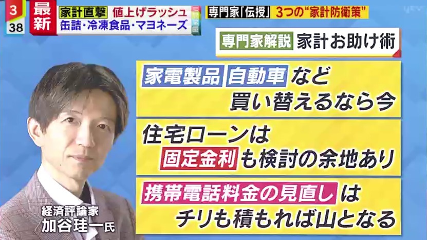 「日用品は、毎日使うものですし、買いだめすると余らせてしまったりするので、ここで努力しても大きな効果は期待できません。そこで、値段が上がる前に家電や自動車など大物を買い替えるのが効果的です。そして住宅ローンはインフレが長期化して、金利が上がると予測するのなら、固定金利も一つの選択肢です。節約というよりは損をしない選択を考えるということです」