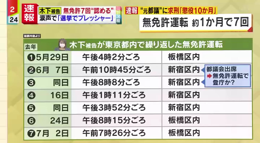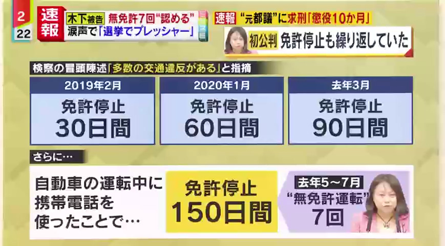 「木下被告は無免許運転をした理由を、『再選を目指す都議選が迫っていて、ポスターの貼り換えなど車が必要な作業が毎日山のようにあり、コロナ禍でボランティアも少なく、心身ともにプレッシャーがかかる中でまともな判断ができず、無免許運転を繰り返した。』と供述し、今後について『運転免許の再取得のつもりはなく、車も処分した。』と述べました。」
