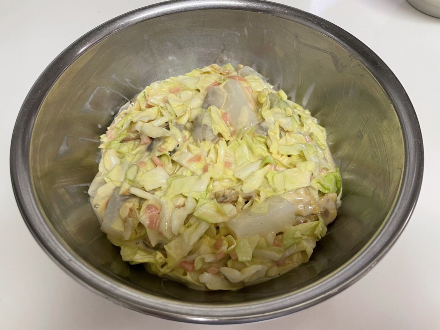 ② 豚肉以外の材料を混ぜ合わせる(イカフライは食べやすい大きさにして混ぜ合わせる)