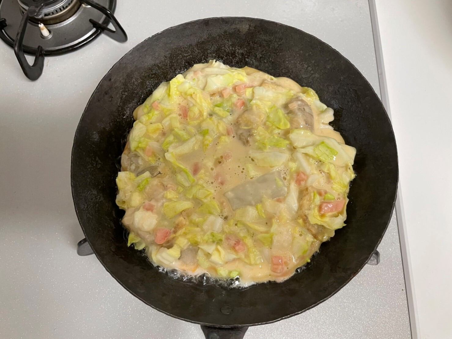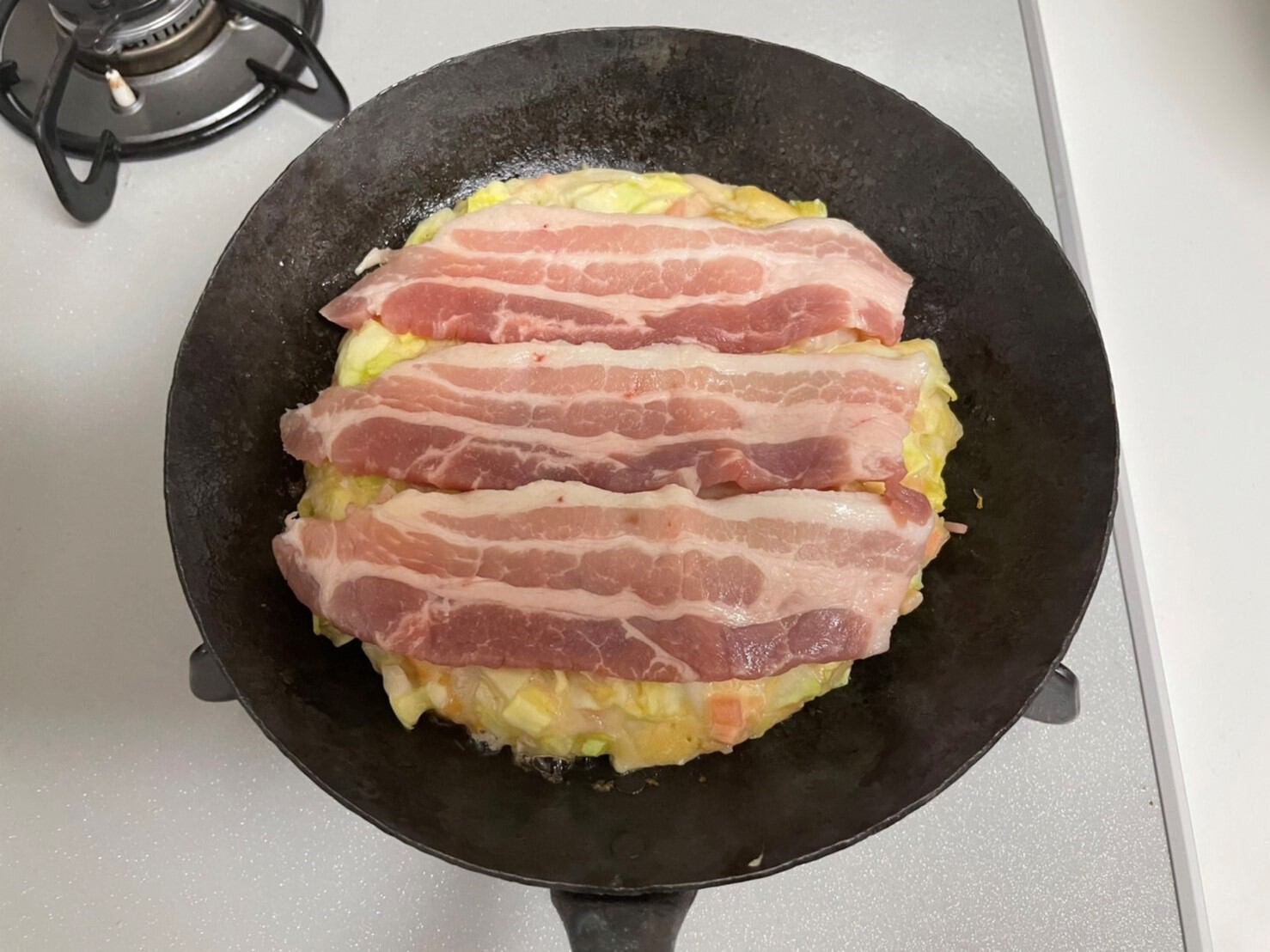 ③温めたフライパンや鉄板にサラダオイルを入れ片面を焼き、片面は豚バラを敷いた上にのせて焼き上げる。