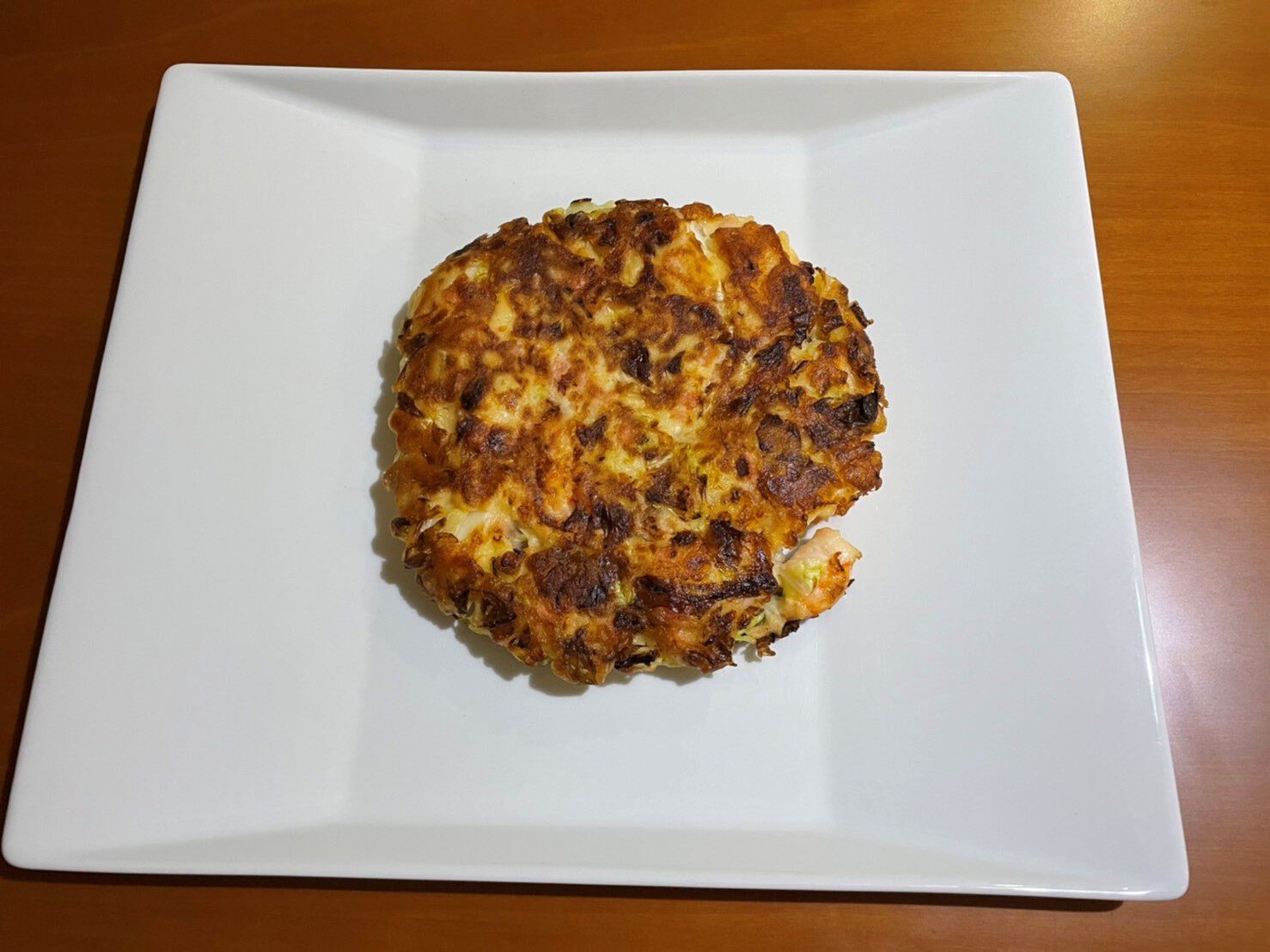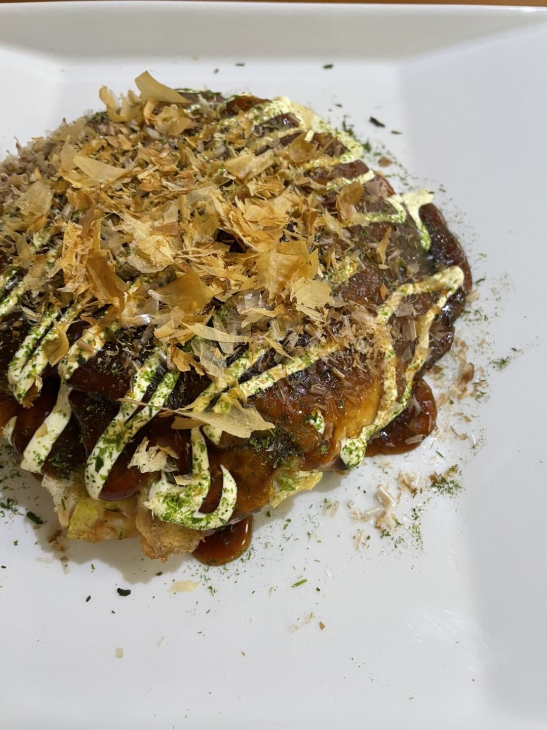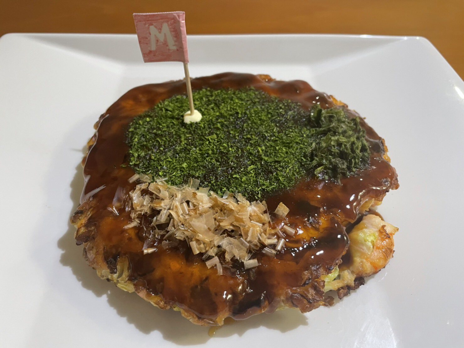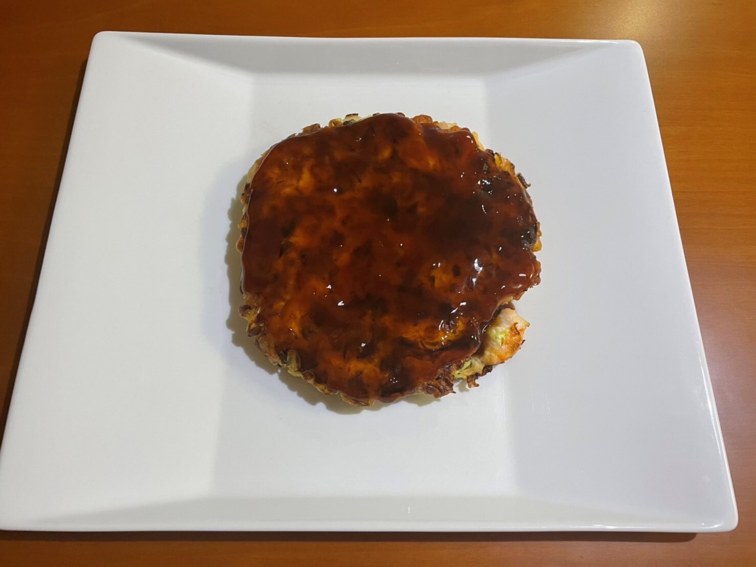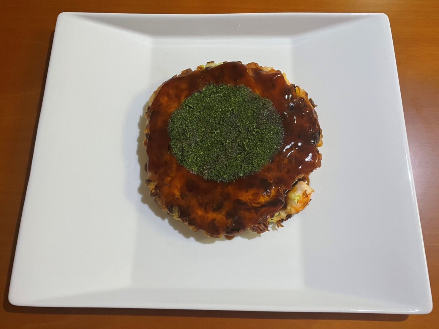 ④出来上がったお好み焼きを皿に乗せ、お好み焼き用ソース、青海苔、鰹節、マヨネーズをかけて出来上がり。