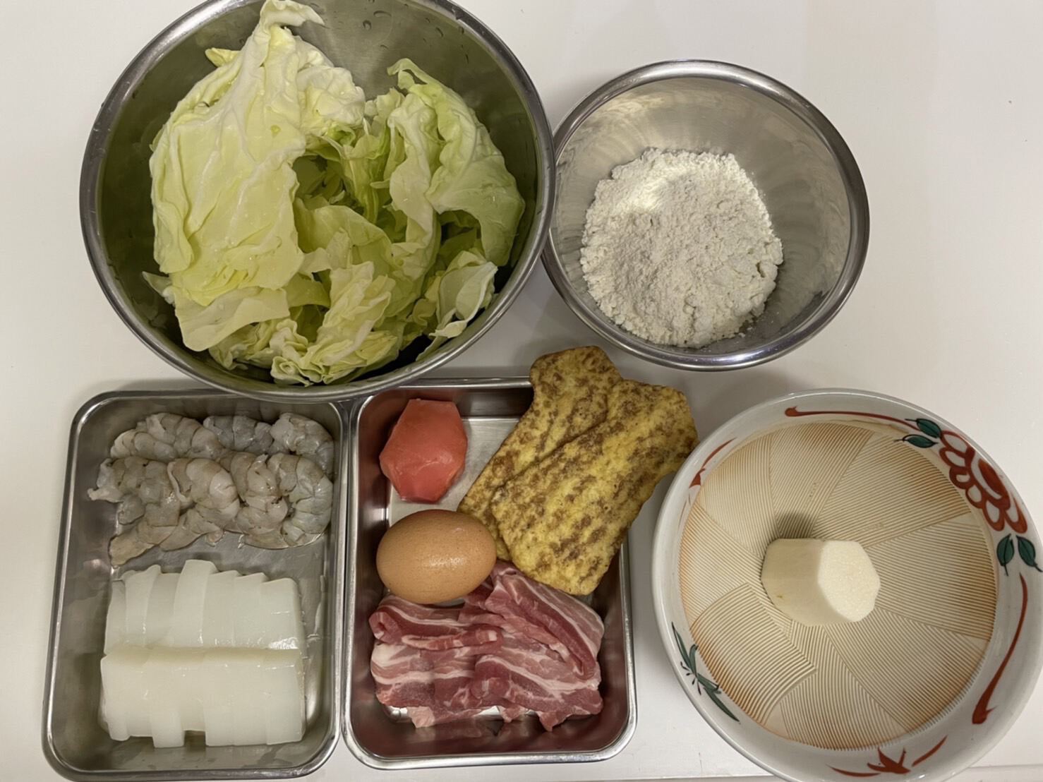 ① キャベツを粗みじん、生姜をみじん切り、海老、イカはざく切り、山芋は擦っておく。