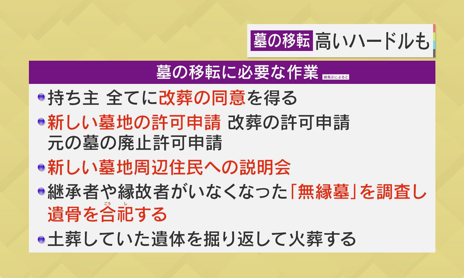 また、墓を動かすには、「持ち主全てに改葬の同意を得る」「新しい墓地の許可申請、改装の許可申請、元の墓の廃止許可申請」「新しい墓地周辺住民への説明会」「継承者や縁故者がいなくなった『無縁墓』を調査し、遺骨を合祀する」「土葬していた遺体を掘り返し火葬する」などの必要があり、家の立ち退きよりもすることが多いといわれています。