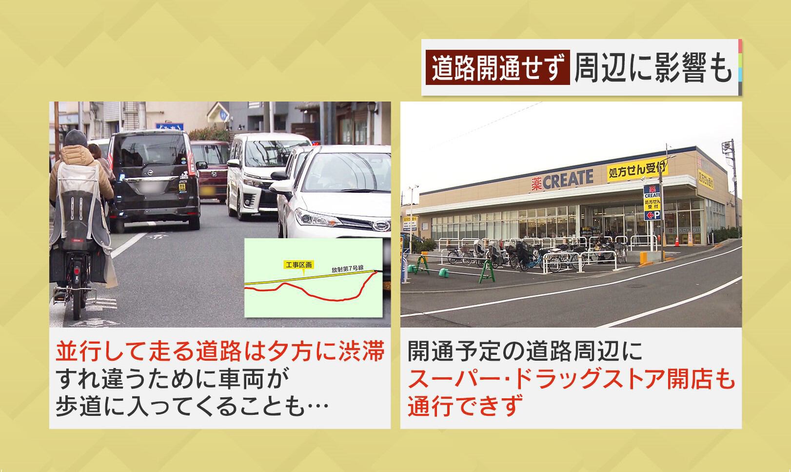 この計画道路「放射7号線」に並行している道は、幅が狭く夕方に渋滞が発生し、すれ違うために車両が歩道に入ってくることもあり、危険な状態になることもあるそうです。また、開通予定の道路周辺にはスーパーやドラッグストアも開店していますが、「放射7号線」が開通していないため、車では行けない状態になっています。