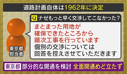 「放射7号線」の道路計画自体は、1962年に決定していたということです。なぜもっと早く寺と交渉してこなかったのでしょうか?東京都の担当者は、「まとまった用地が確保できたところから順次工事を行っています。個別の交渉については、回答を控えさせていただきます」としています。東京都は、今後部分的な開通を検討していますが、全面開通のめどは立っていないということです。
