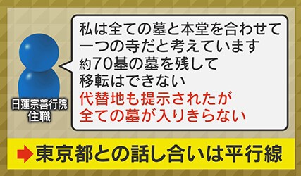 住職は「私は全ての墓と本堂を合わせて一つの寺だと考えています。約70基の墓を残して移転はできない。代替地も提示されたが、全ての墓が入りきらない」と話していて、東京都との話し合いは平行線だということです。