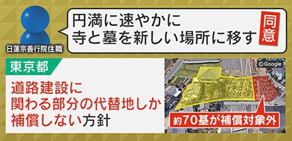 なぜ墓の立ち退きは進まないのでしょうか?立ち退きを求められている日蓮宗善行院の住職は、「円満に速やかに寺と墓を新しい場所に移すことには同意」しています。しかし、東京都は「道路建設に関わる部分の代替地しか保証しない方針」で、約200基の墓のうち約70基が補償の対象外になっています。