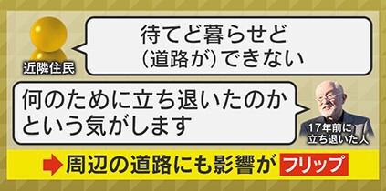 近隣住民は「待てど暮らせど(道路が)できない」、また17年前に立ち退いた人は「何のために立ち退いたのか、という気がします」などと語っています。
