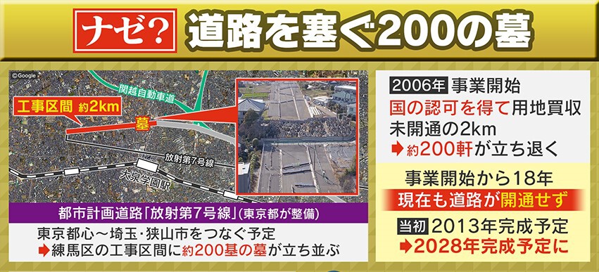 墓に塞がれているのは、東京都が整備している「放射第7号線」と呼ばれる道路です。東京都心と埼玉県狭山市をつなぐ予定となっていますが、練馬区の約2㎞の工事区間に約200基の墓が立ち並んで開通できない状態になっています。2006年にこの区間の工事が認可され、その後、用地買収が始まりました。この工事区間の2km区間についても、約200軒の建物がすでに立ち退いています。しかし、事業開始から18年経った現在でも道路は開通していません。当初2013年に完成を予定していましたが、延期を重ね、現在2028年完成予定となっています。