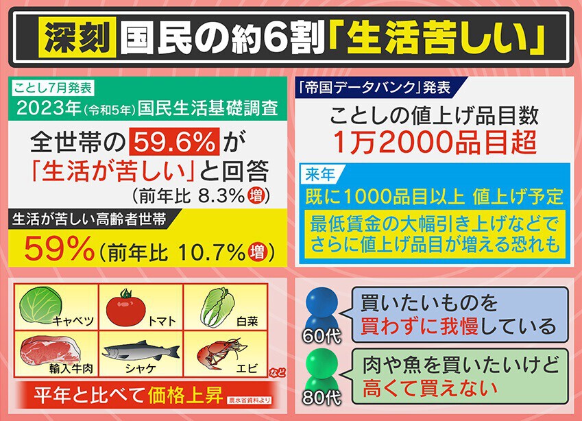 国も警鐘を鳴らす“低栄養シニア”。その要因の一つとして考えられるのが、物価高による“買い控え”です。2024年7月に発表された国民生活基礎調査では、全世帯の59.6%が「生活が苦しい」と回答し、高齢者だけを見ても59%もいます。