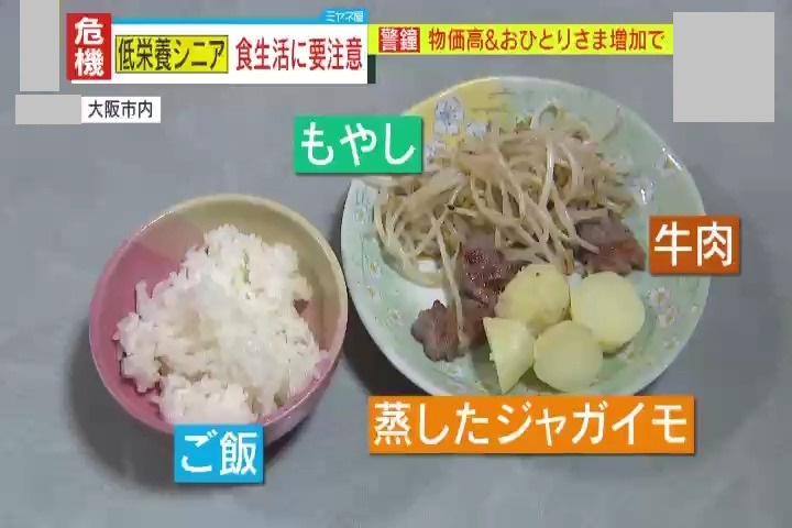 さらに「低栄養シニア」が注視される背景には、高齢者ならではの事情も…。大阪市内に住む、現在一人暮らしの80代男性は、今、高齢者を中心に増えている単身世帯です。果たして一人でバランスの良い食事がとれているのでしょうか。この日の夕食のメニューは『少量の牛肉』に『蒸したじゃがいも』と『もやし』、そして『ご飯』を少しだけでした。