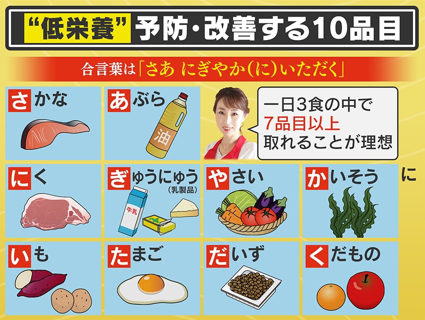 管理栄養士・金子さんによる低栄養の予防・改善の合言葉は『さ・あ・に・ぎ・や・か・(に)い・た・だ・く!』だといいます。この言葉に当てはまる食材『さかな・あぶら・にく・ぎゅうにゅう(乳製品)・やさい・かいそう・いも・たまご・だいず・くだもの』この10品目を、1日3食の中で7品目以上取れることが理想です。