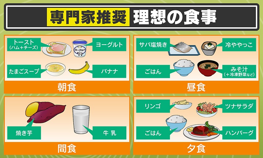 そして専門家が推奨する理想の食事ですが、一人暮らしだと調理が大変なので、ありものでなるべくいけるように考えていただきました。朝食は『トースト(ハム+チーズ)・ヨーグルト・たまごスープ・バナナ』。昼食は『サバの塩焼き・冷ややっこ・ごはん・みそ汁(+冷凍野菜など)』。おやつは『焼き芋・牛乳』。夕食は『ハンバーグ・ツナサラダ・ごはん・リンゴ』です。これで10品目すべてが入ります。