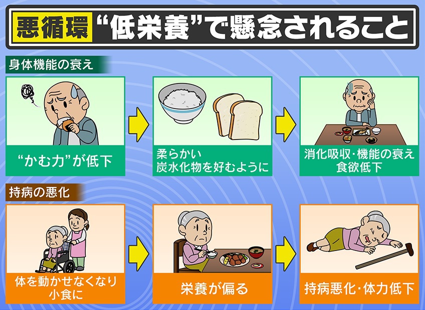 そして“低栄養”で懸念される悪循環についてですが、例えば、身体機能の衰えで“噛む力”が低下し、柔らかい炭水化物を好むようになります。そうすると消化吸収・機能の衰え、食欲低下につながります。さらに持病があると、体を動かせなくなり小食に。そうなると栄養のバランスが偏り、持病が悪化して体力が低下してしまうということなります。