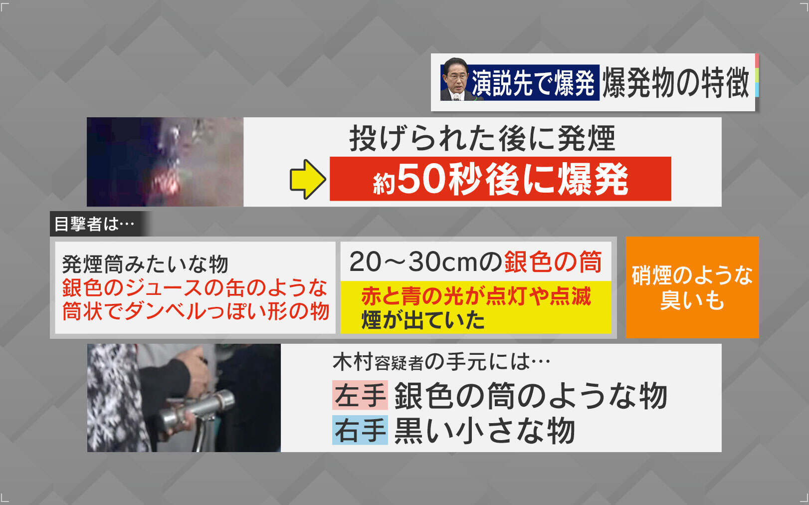 爆発物の特徴ですが、投げられた後に発煙し、約50秒後に爆発したということです。目撃者によると「発煙筒みたいな物、銀色のジュースの缶のような筒状でダンベルっぽい形の物」「20~30cmの銀色の筒、赤と青の光が点灯や点滅をしていて煙が出ていた」「硝煙のような臭いもした」ということです。そして、木村容疑者は、左手に銀色の筒のような物、右手に黒い小さい物を持っていたということです。