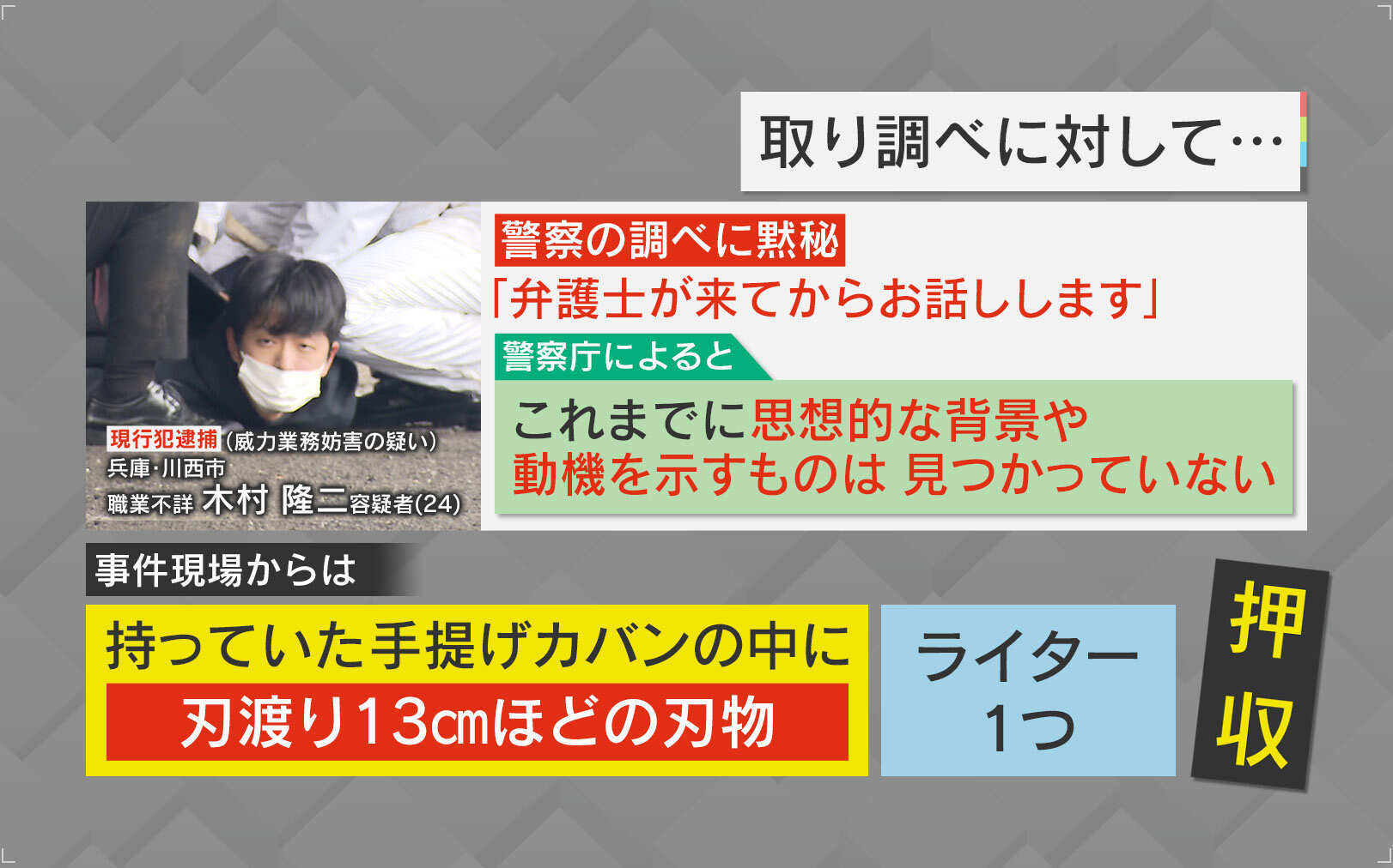 逮捕された木村隆二容疑者は、警察の調べに対し「弁護士が来てからお話しします」と黙秘しているということです。警察庁によると、これまでに思想的な背景や動機を示すものは見つかっていないということです。また、持っていた手提げカバンの中から、刃渡り13センチほどの刃物とライター1つが押収されています。