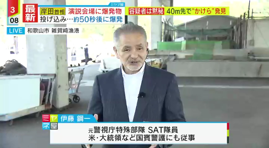 岸田総理の演説会場に爆発物が投げ込まれた事件で、威力業務妨害の容疑で木村隆二容疑者が現行犯逮捕されました。また、現場検証の結果、爆発物の本体の一部とみられる “筒状のもの”が、投げ込まれた場所から約40m離れた場所で見つかったことがわかりました。この爆発物の正体は?当時の警備態勢は十分だったのか?銃器評論家の津田哲也氏と警視庁特殊部隊・SATの元隊員の伊藤鋼一氏が解説します。
