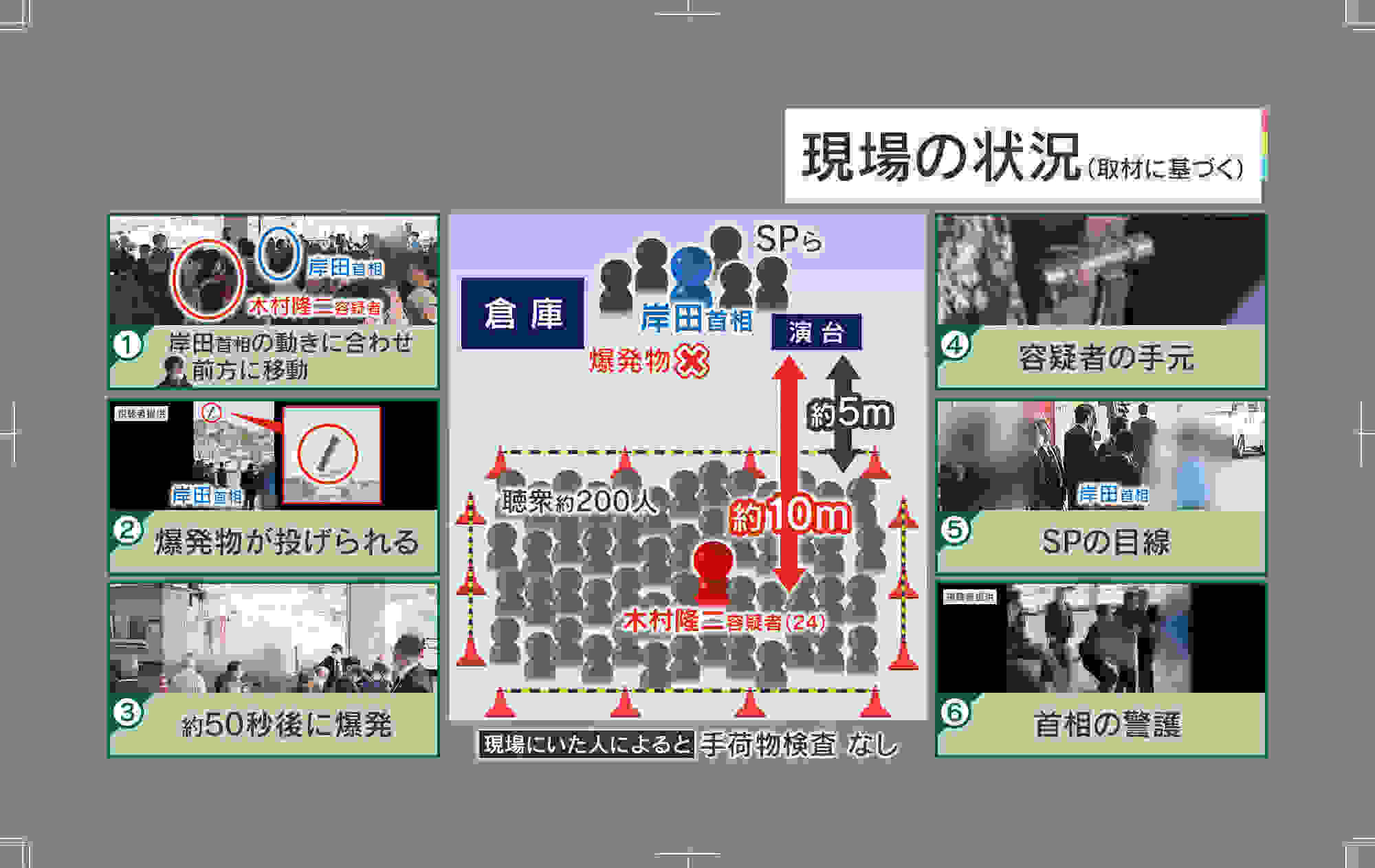 岸田首相と聴衆の間は約5m、木村容疑者と岸田首相との距離は約10mあり、聴衆は約200人でした。現場にいた人によると、「手荷物検査などはなかった」ということです。