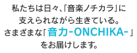 私たちは日々、「音楽ノチカラ」に支えられながら生きている。 さまざまな「音力-ONCHIKA-」をお届けします。私たちは日々、「音楽ノチカラ」に支えられながら生きている。 さまざまな「音力-ONCHIKA-」をお届けします。