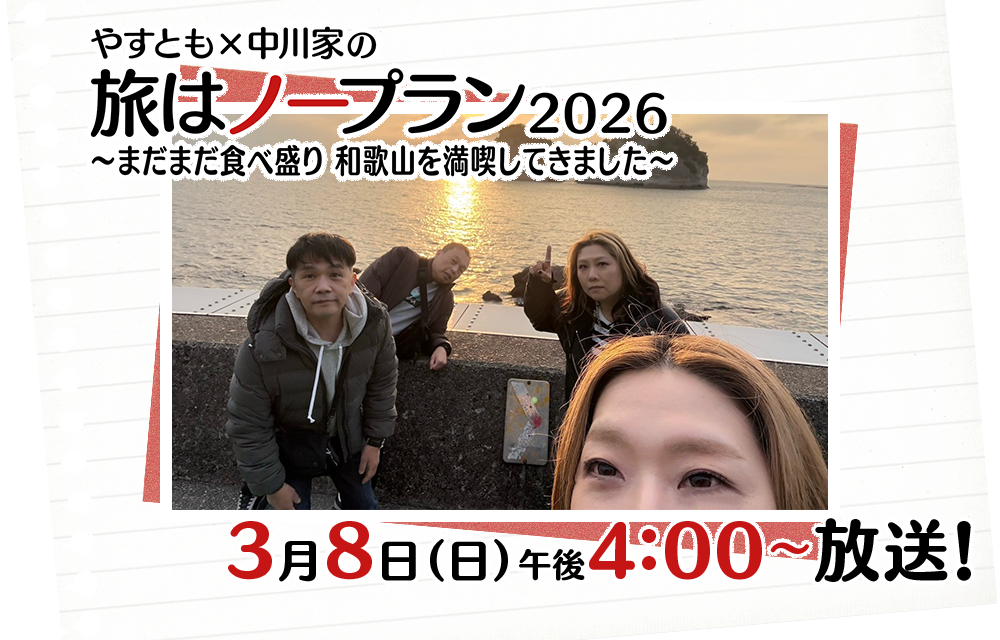 第13弾となる今回の旅の舞台は、中川家の2人が選んだ「和歌山」。夏のイメージが強い和歌山ですが、冬ならではのグルメや絶景が満載!自由気ままに1泊2日の旅を繰り広げます。