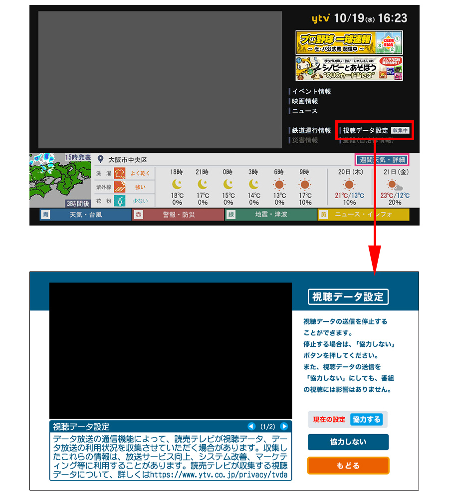 停止する場合は、下記の通り、読売テレビのデータ放送の放送局トップ画面を表示し、「視聴データ設定」画面で「協力しない」ボタンを押してください。再度ご協力いただける場合には、「協力する」ボタンを押してください。