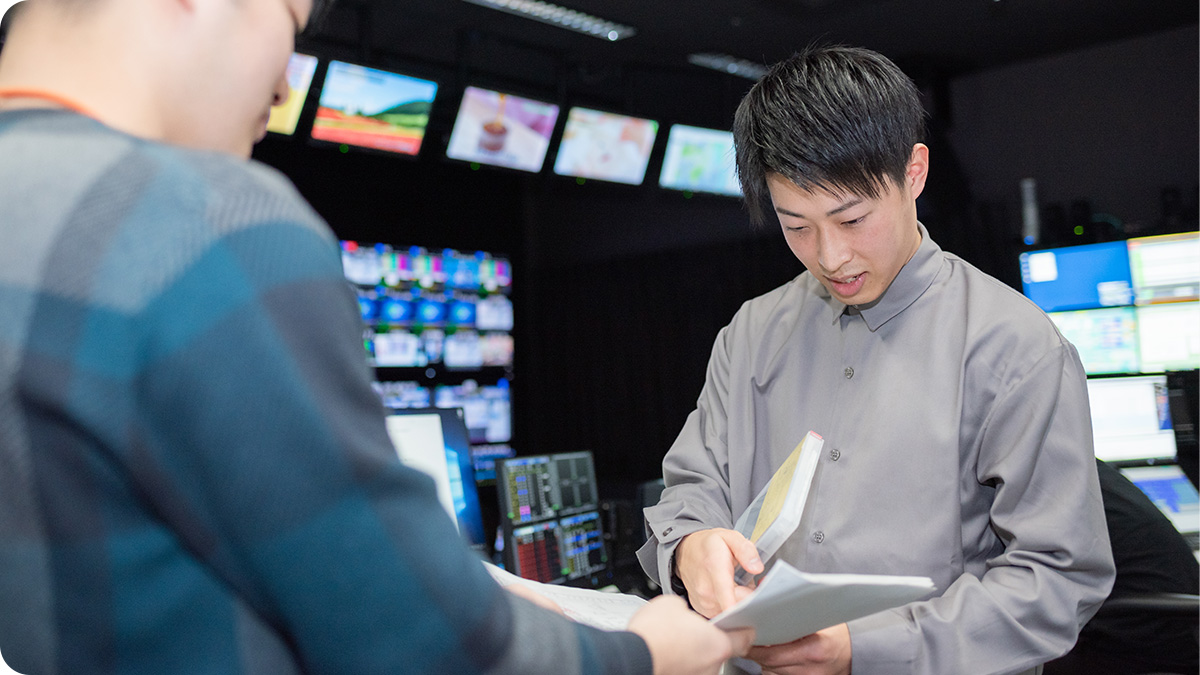 技術局放送実施部の放送進行担当として仕事をしています。フォーマットや放送要領という番組の骨組みとなるものの作成や、最終的に放送するOAデータの作成、番組回線の管理や、日々の運用のチェックなどを行っています。入社するまではこんな仕事があるとは知らなかったのですが、番組に関するとても重要な、放送事故にも直結する仕事なので、かなり緊張感を持って仕事をしています。