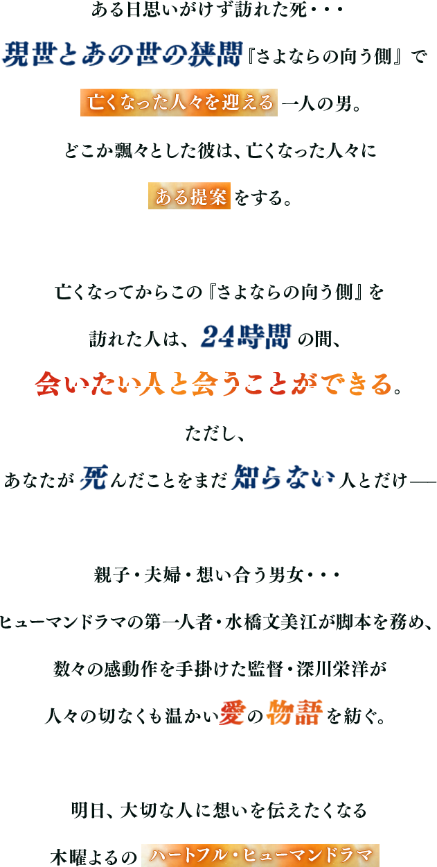 この『さよならの向う側』は今までで一番の特別な想いがこもった作品です。そしてその作品を同じくらいの熱をもって、素晴らしいキャストさんとスタッフさんに映像化して頂きました。観終わった後にはきっと大切な人に会いに行きたくなるドラマになっていますので楽しみにしていてください。