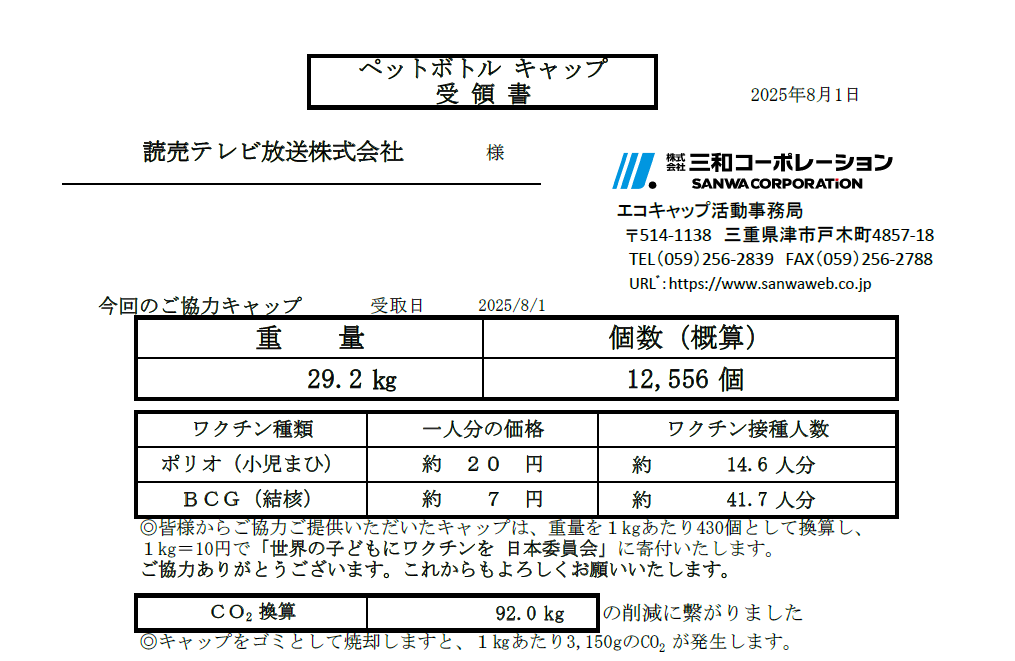 読売テレビでは、これからも読売テレビ社内でのペットボトルキャップの回収継続と、夏の大型イベントでのペットボトルキャップ回収を続けていきます。