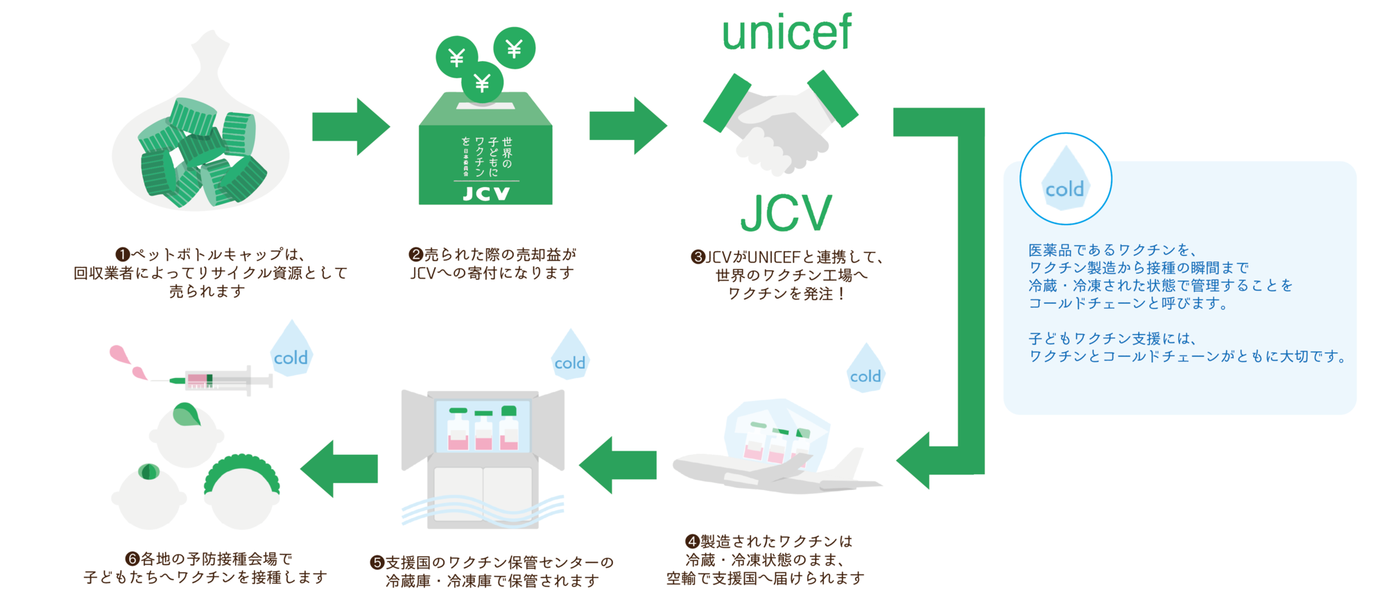 この取り組みは、ペットボトルキャップをごみとして廃棄した際に排出される CO₂の削減 と、ボトルキャップを 世界の子どものワクチン寄付に活用 する事を目的におこないました。