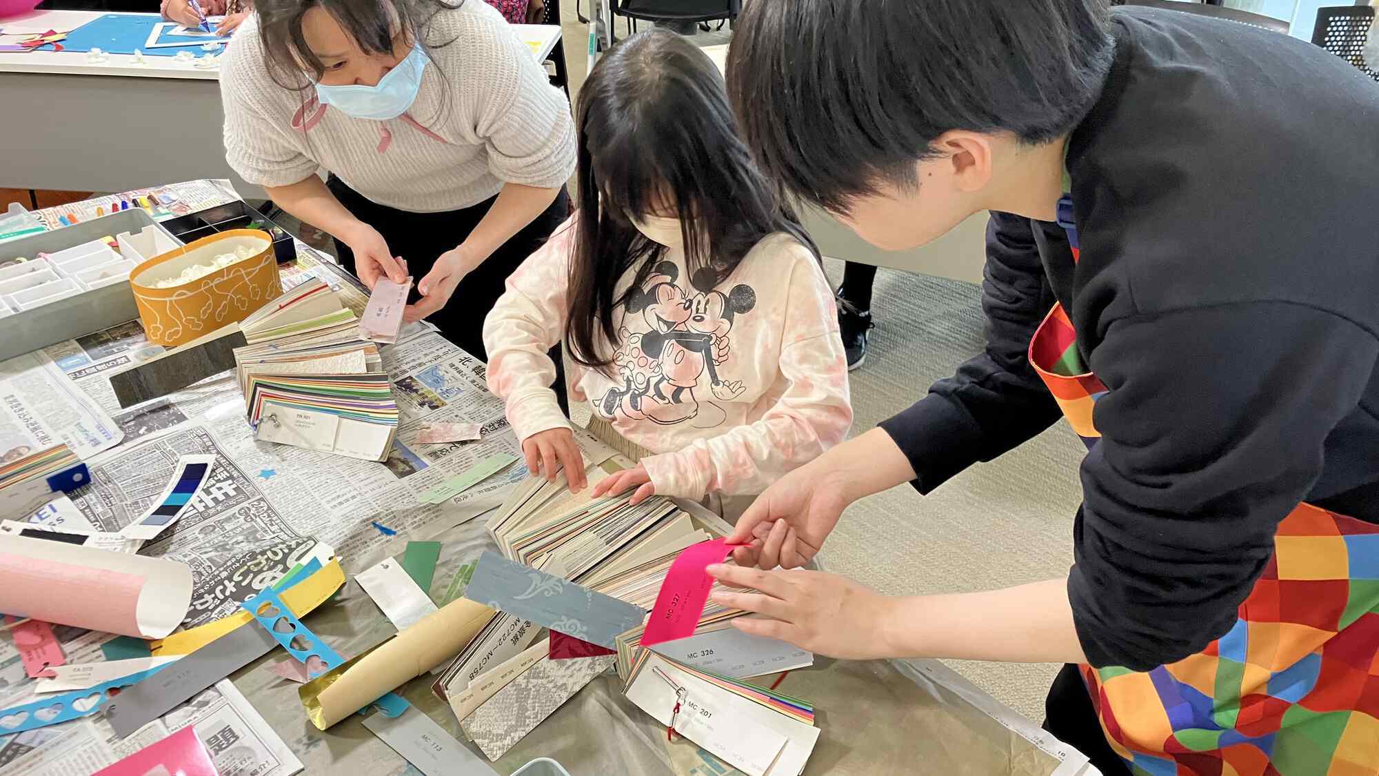 装飾用の材料として、制作局美術部に眠る“もったいない”もたくさん用意しました。スタジオセットで使った壁紙の余り、廃盤になったカラー見本帳、スタジオを華やかに飾った造花などを使い、子どもたちも思い思いの作品を作っていきます。