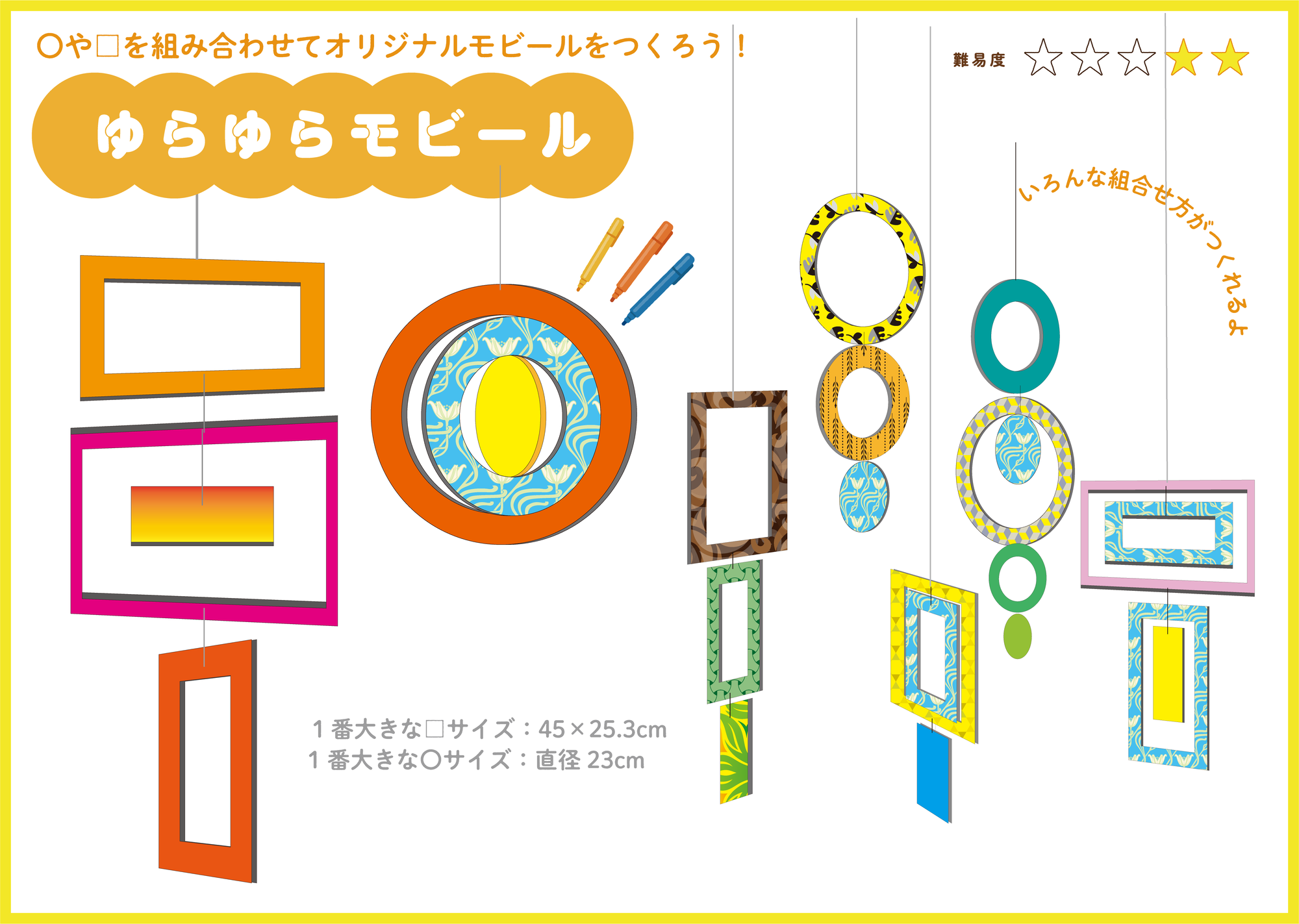 「お絵かきパズル」はパズルの型だけを用意しており、どんなパズルに仕上げるかは子どもたちの自由!「ゆらゆらモビール」もどんな形を作るかは子どもたちのアイデア次第です。さぁ、子どもたちはいったいどんな作品を作ったのでしょうか?