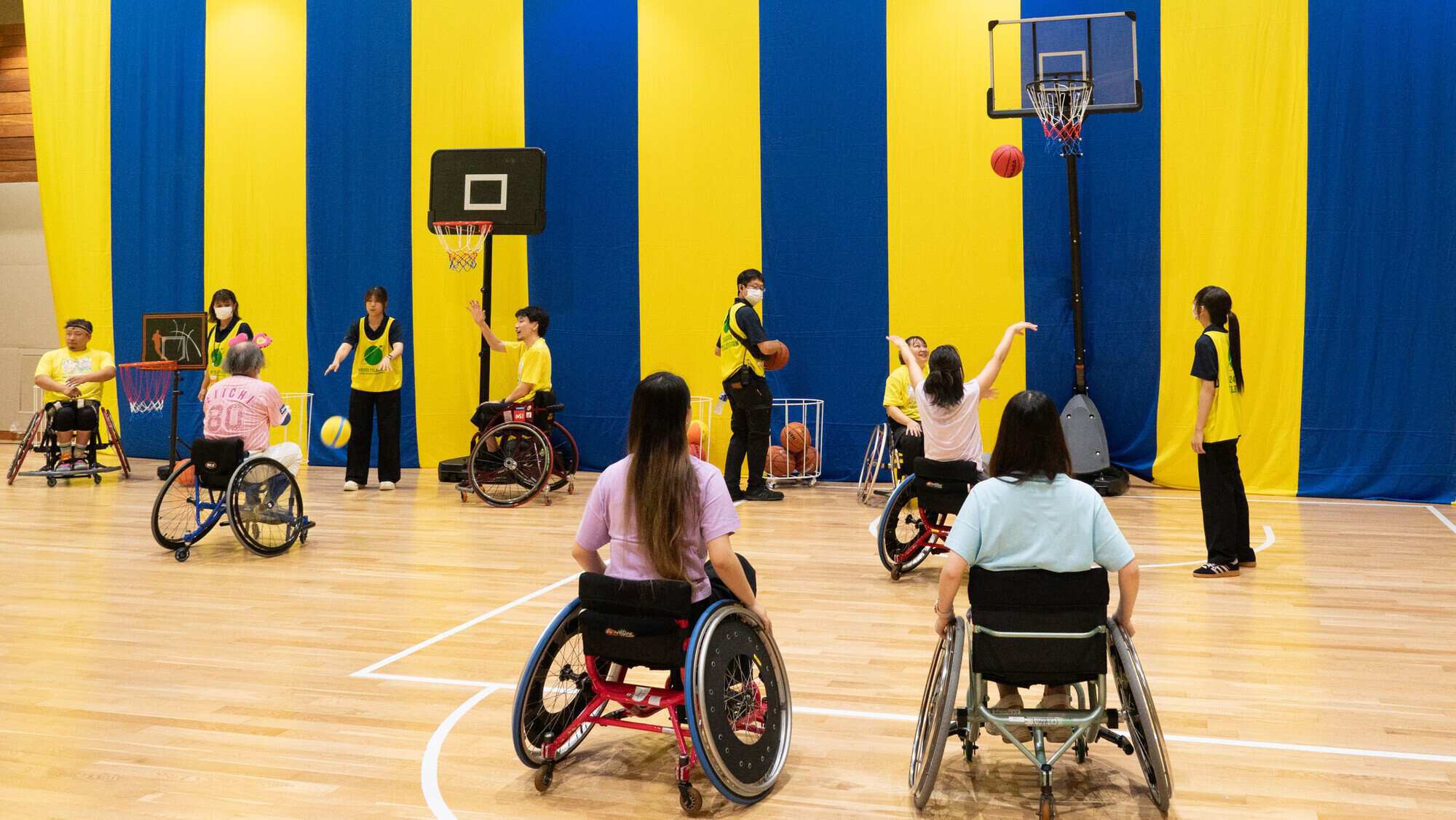24時間テレビの福祉支援で寄贈している「バスケットボール用車いす」と「ボッチャセット」。