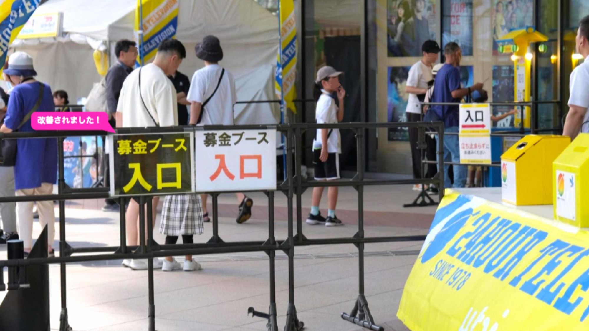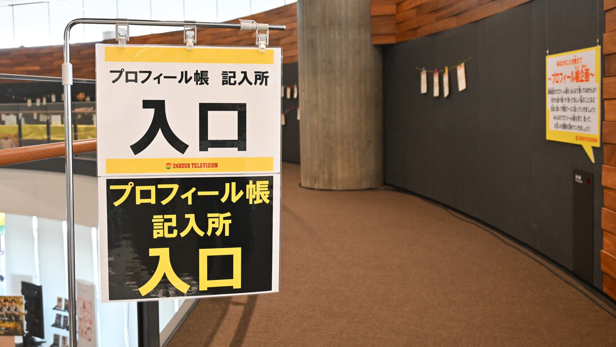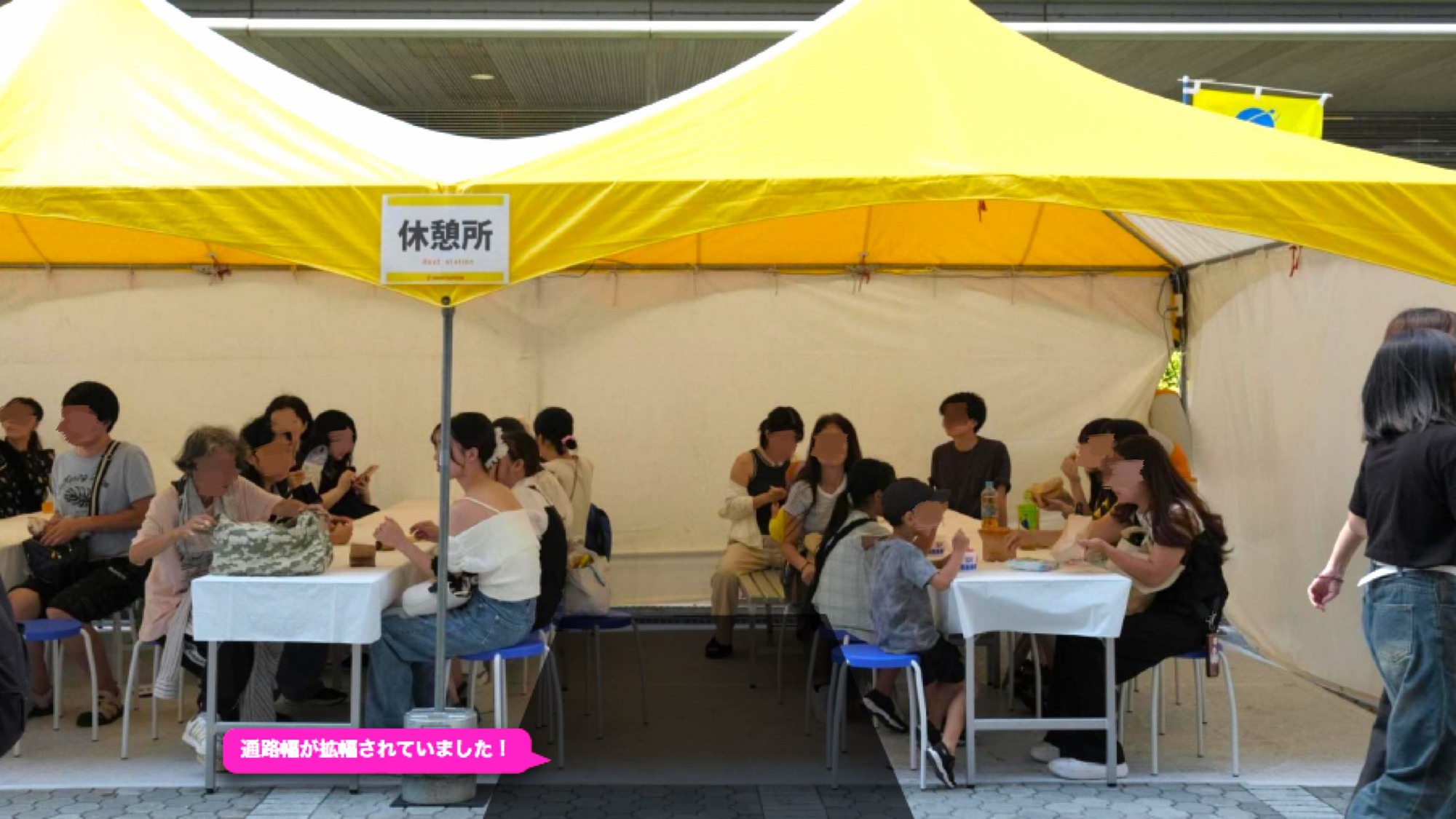 募金受付・グッズブース机の横断幕を取り払い、 机の膝隠しを全てスタッフ側の向きに改善!休憩所もより多くの方に利用しやすい空間へ。 入口付近のベンチを丸椅子に変更・机の向きも変更したことで、通路幅を拡張!車いす利用者にとって利用しやすい環境へアップデートしています。