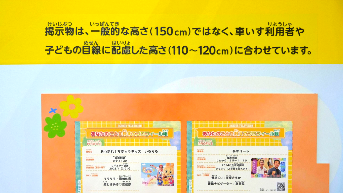 掲示物の高さを一般的な目線の高さ(140~150cm)から、車いす利用者や子どもの目線に配慮し、掲示中心部を床から110~120cmに設定し展示をおこないました。また、掲示の高さを意図をもって設定していることを展示物の近くに表示し、来場者へ発信しました。