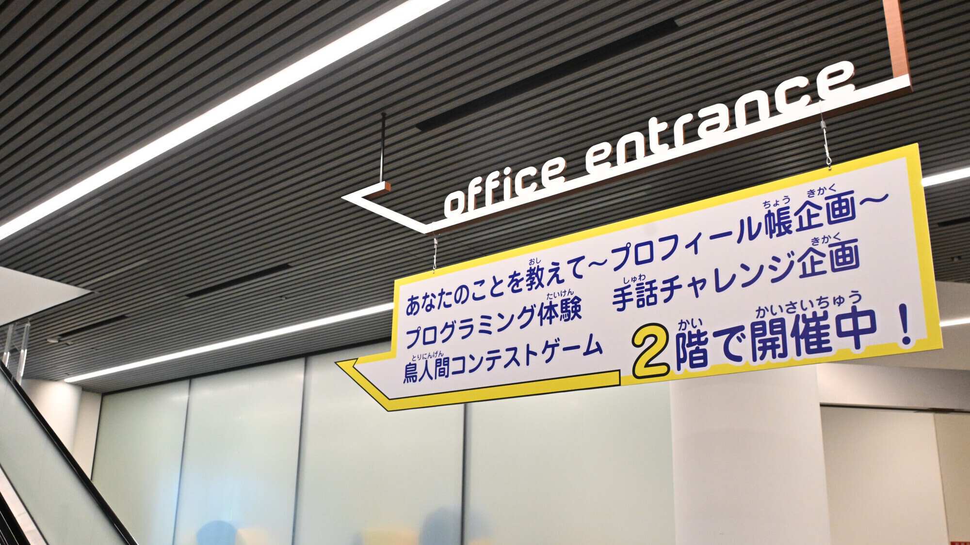 サイン表示は、コントラストのある配色(黒色に黄色)をもちいて作成。色覚障がいのある方だけでなく、車いす利用者にも情報が伝わりやすい環境へ改善しました。