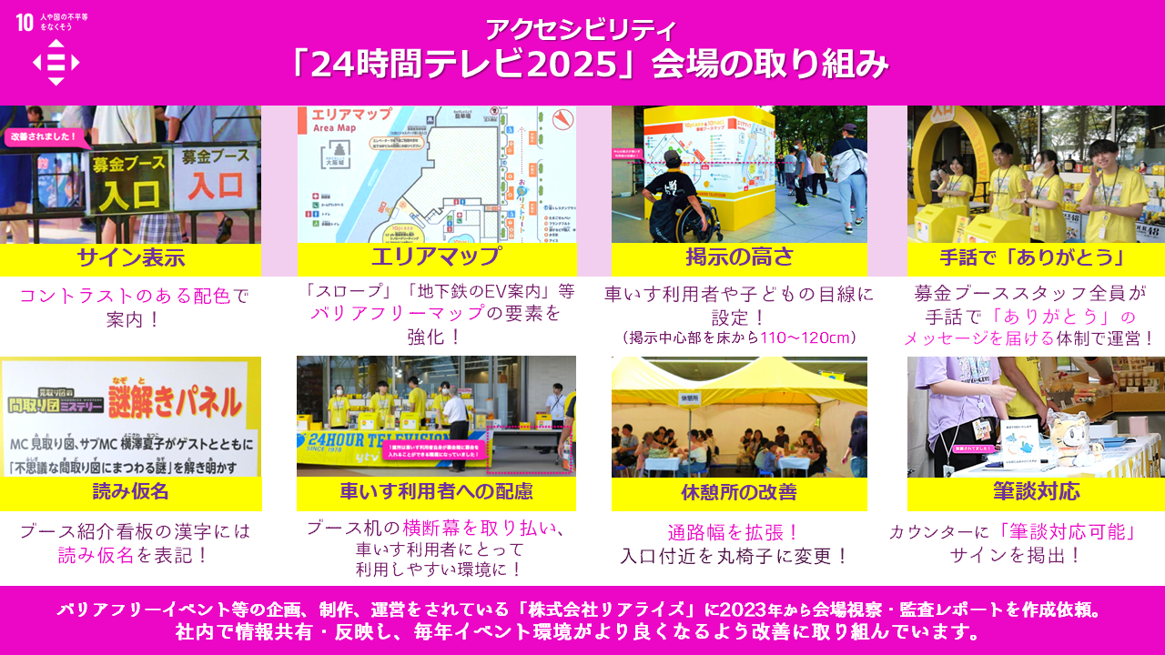読売テレビでは“みんなにやさしく”誰もが楽しめる大型イベントを目指し、バリアフリーイベント等の企画・制作・運営をされている「株式会社リアライズ」に2023年から会場視察と監査レポートの作成を依頼。レポートに基づいたサステナブルな会場づくりの取り組みをご紹介します。